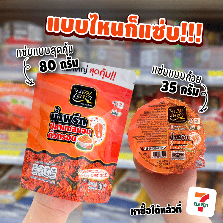 น้ำพริกปลาแซลมอนคั่วกรอบ ไซส์สุดคุ้ม 80 กรัมเอาใจสายข้าวคลุกด้วยน้ำพริกปลาแซลมอนคั่วกรอบ รสชาติจัดจ้าน เข้มข้นกลมกล่อมโรยข้าวเมื่อไหร่ก็อร่อยถึงใจพบกับน้ำพริกในดวงใจของใครหลาย ๆ คน ได้แล้ววันนี้ที่ 7-Eleven ทุกสาขาทั่วประเทศ
